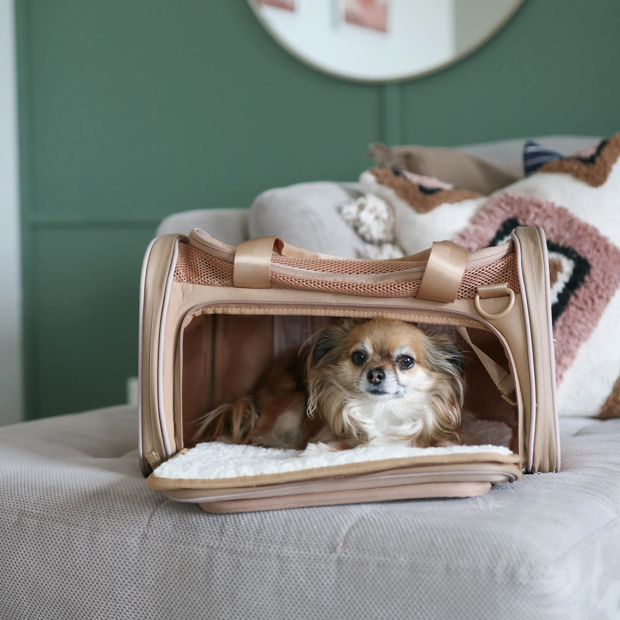This airline-approved pet carrier is perfect for your small dog or cat. With breathable mesh walls, a soft sherpa-lined removable bed, and the option for a dual-use dog leash or shoulder strap, this carrier has everything your pet needs for comfortable travel. Plus, with removable backpack straps and a back trolley pass-through, you can easily carry your pet on your back or suitcase for hands-free convenience!